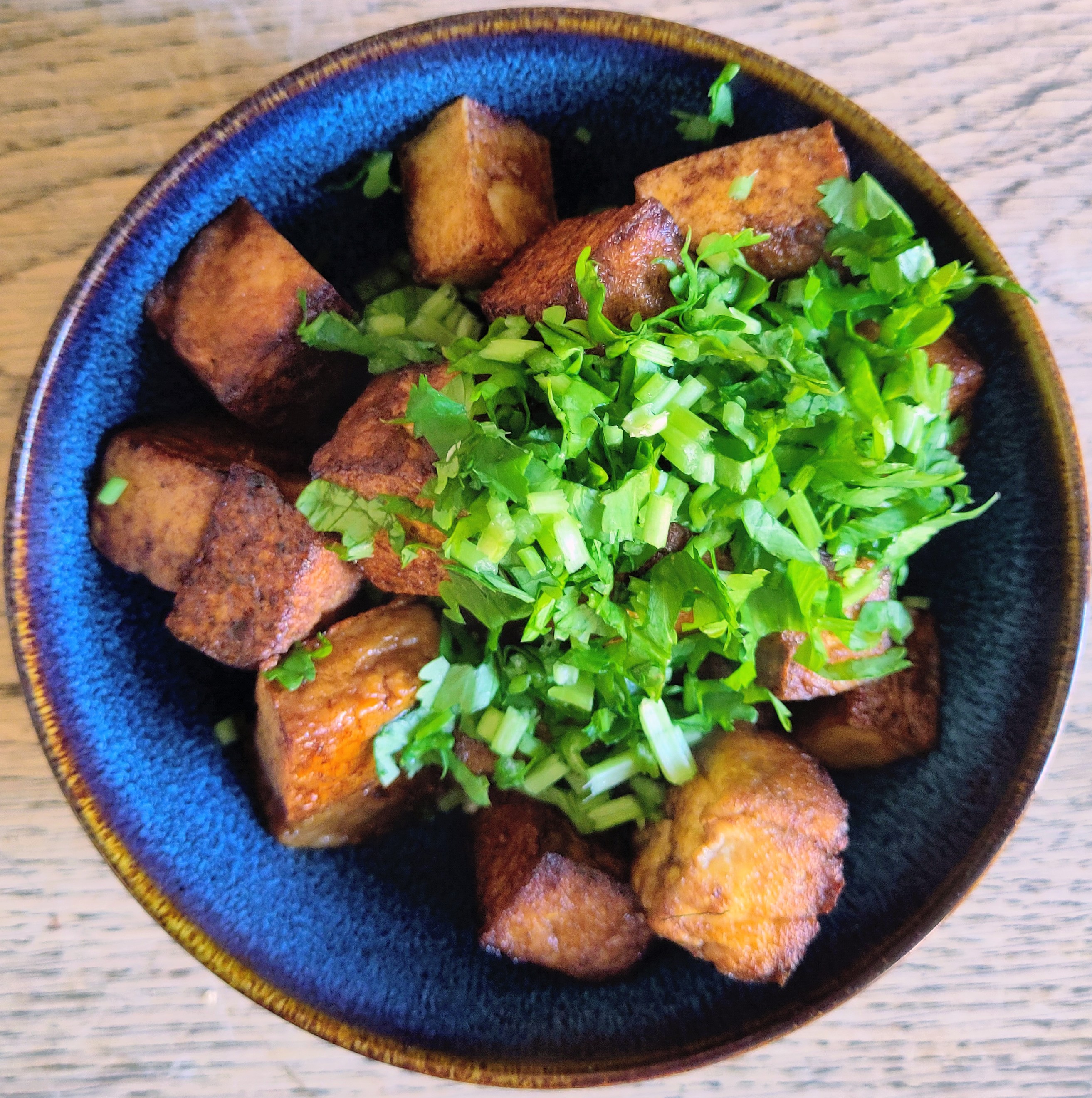 Darauf hatte ich schon den ganzen Tag Appetit: Tofu mit einer ordentlichen Portion Koriander. Dazu Sriracha Sauce mit Lemongrass und fertig ist der weltbesteste Snack!