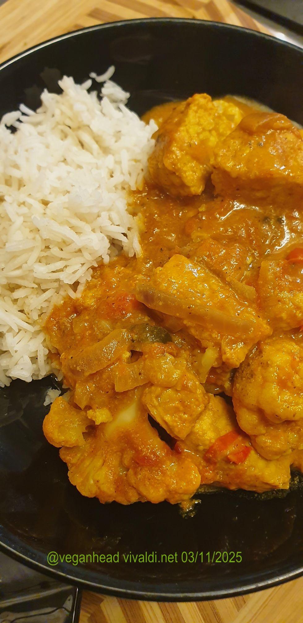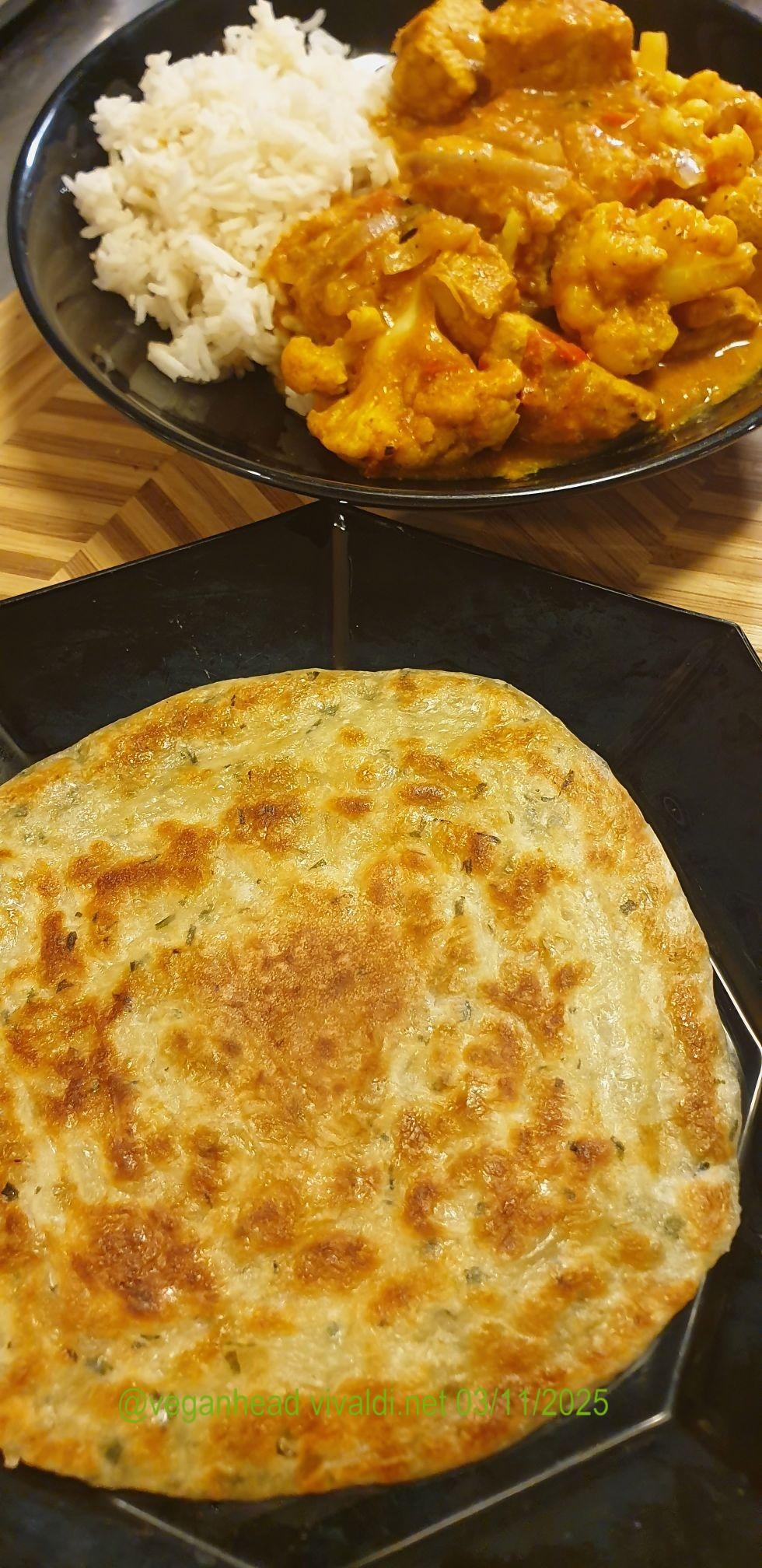 "Vegan Butter Chicken Cauliflower & Tempeh" w/ Garlic Basmati Rice. Served w/ 'Spring Home' Onion Paratha.