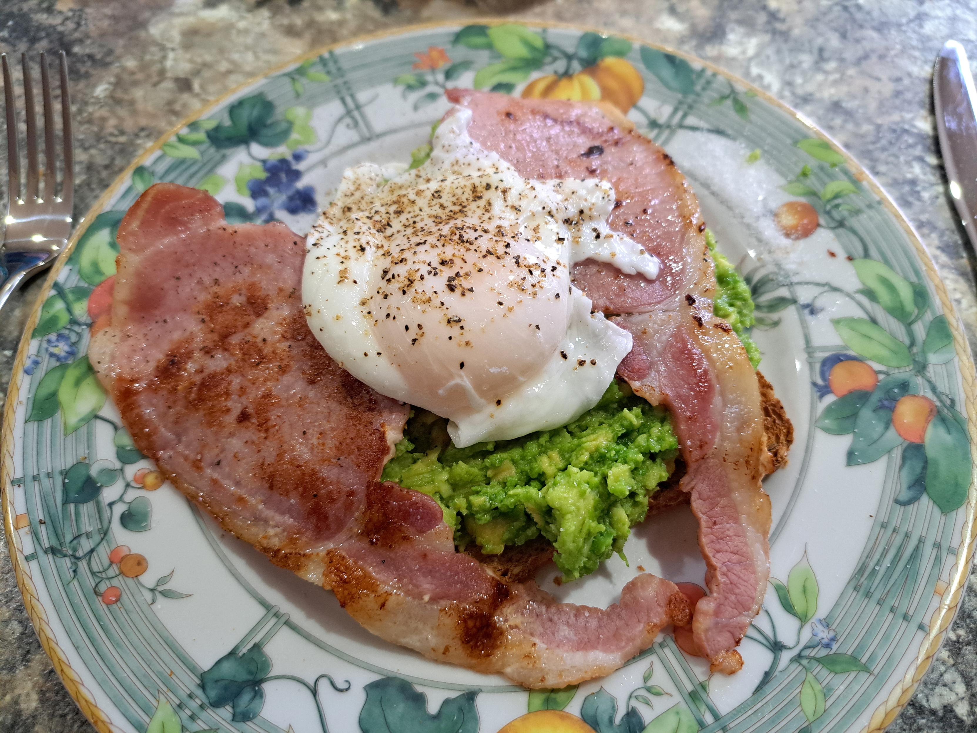 Here's a recent breakfast. Seeded bread toast, with mashed avocado, bacon, and my best poached egg yet.
