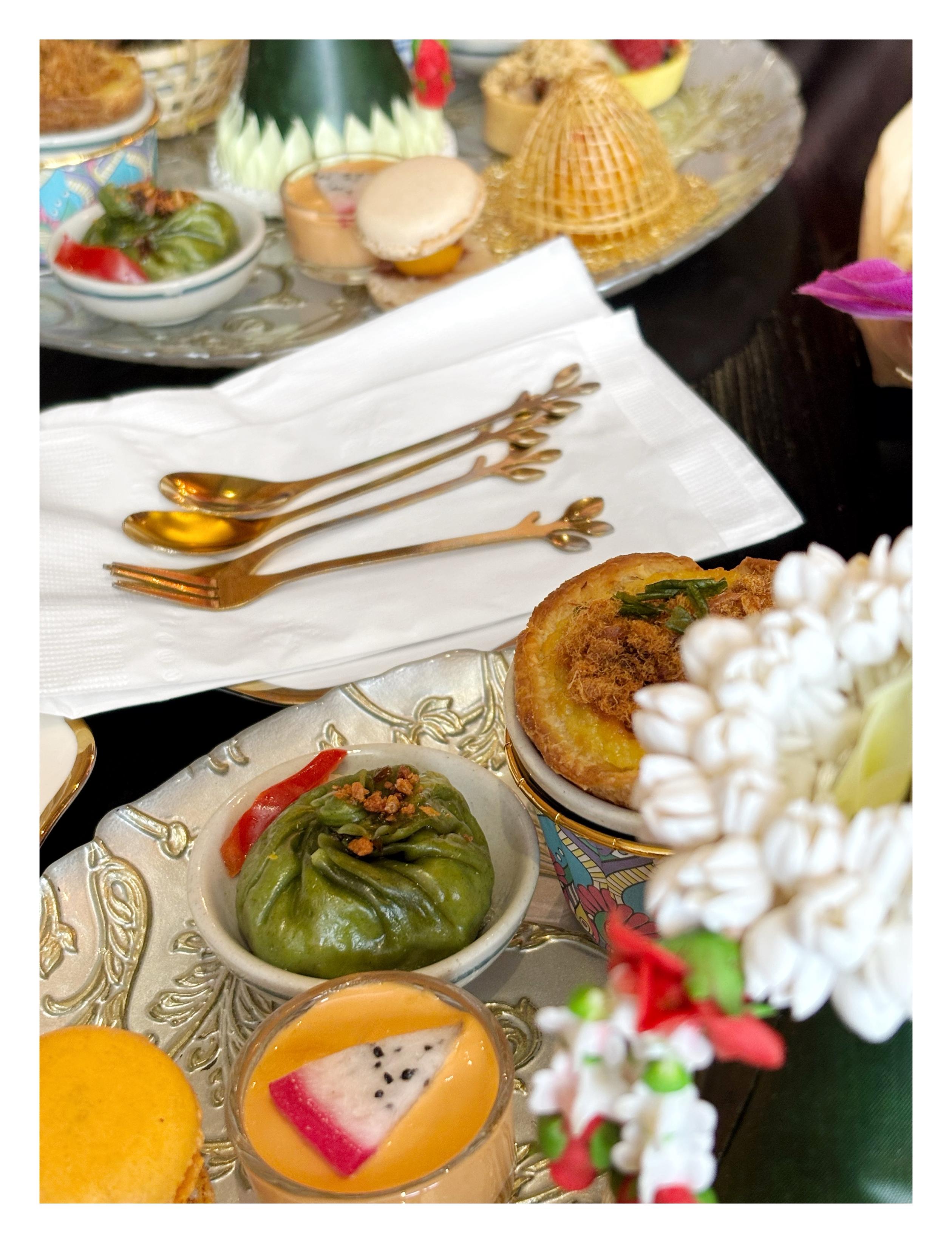 Fancy cutlery and sweet and savory plates, at the Thai Afternoon Tea experience at Cafe Chili in Brooklyn.
