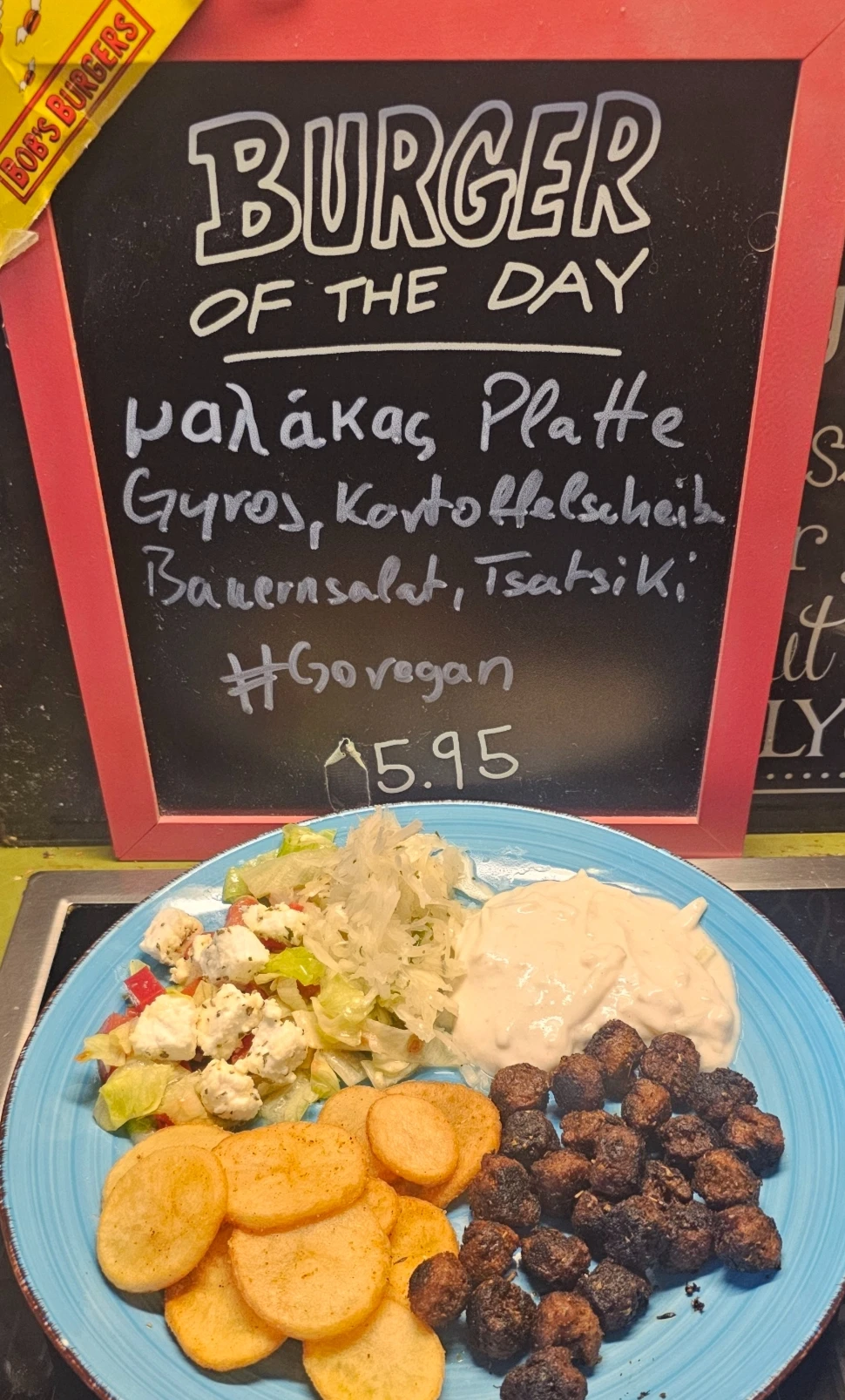 Hellas Zusammen, heute gab es die Malaka-Platte mit Gyros, Kartoffelscheiben, Bauernsalat mit Kraut und Feta und Tsatsiki.