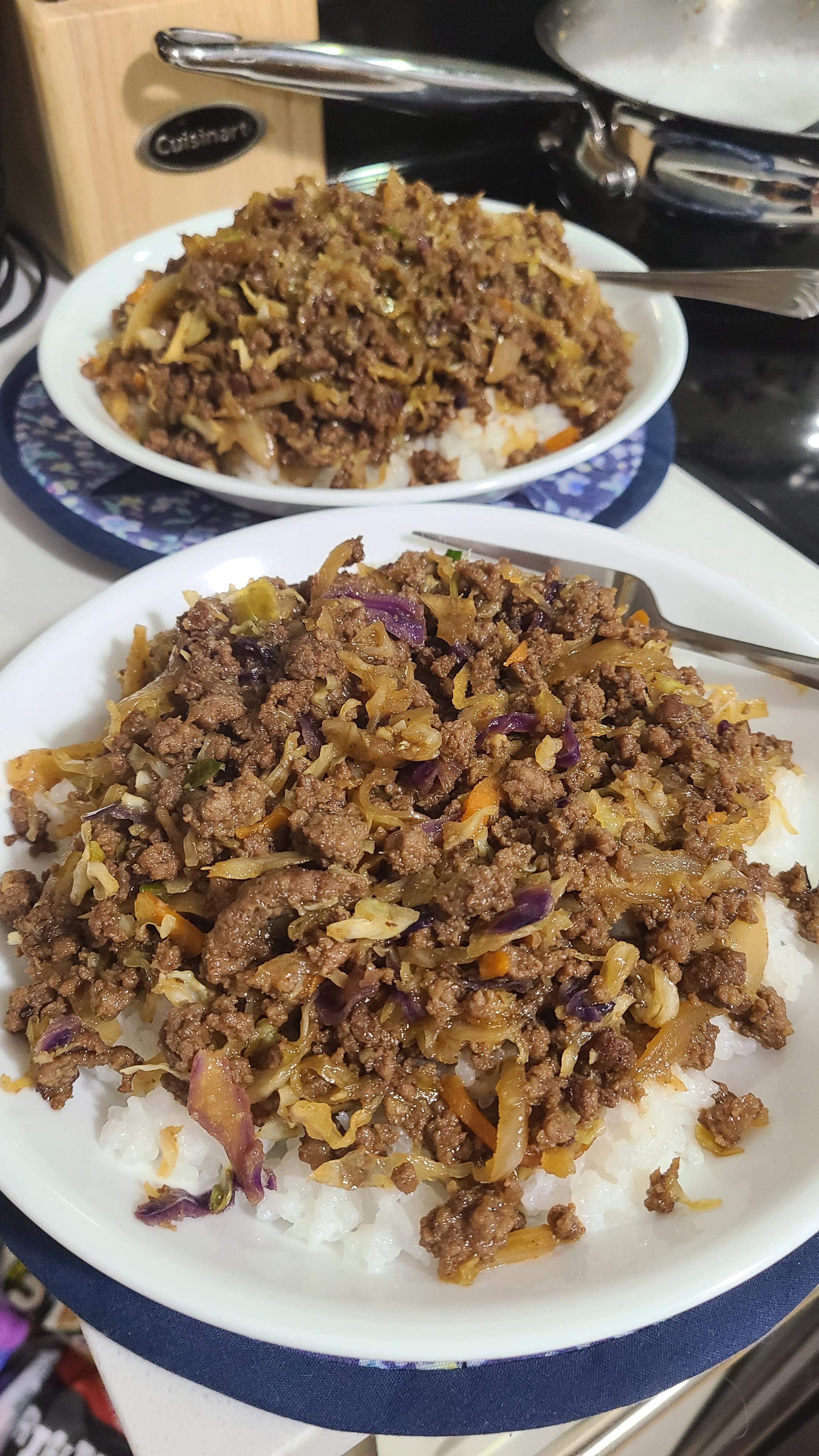 Finally had everything to make a ground beef teriyaki on rice (inspired by a beef spring roll bowl recipe reel I saved) and found the energy to cook it (that and the beef expired tomorrow lol). Stressful but tasted amazing 😄